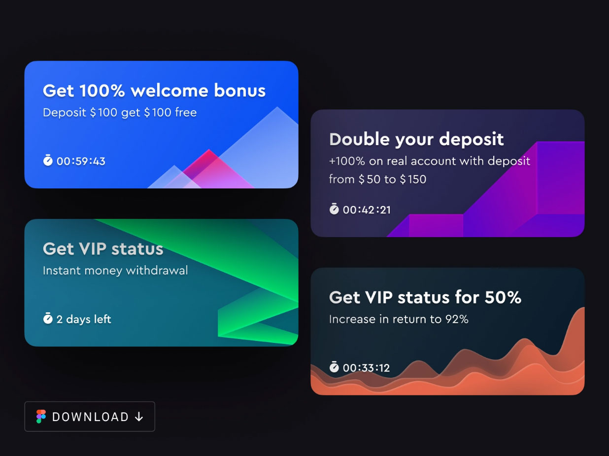 A free collection of 4 mini banners templates which are fully customizable. They are 360px wide and 168px tall. This cool new Figma resource created by Anton Borzenkov. He has made good use of gradients to give them a classy look. Thanks for sharing.