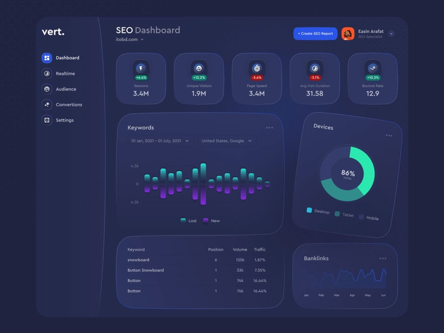 It’s a free Figma dashboard template which could be perfect if used for an SEO dashboard design. Going with the current trends, the template has a dark mode. It could be adapted for pretty much any industry, not only SEO.. This great new freebie created by Easin Arafat.