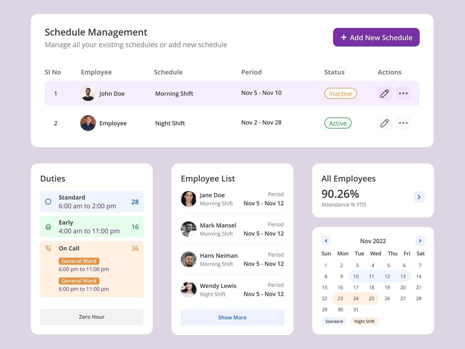 A pack of dashboard components which includes an employee list, duties widget, schedule management section and a calendar component. Thanks to Rajesh Rathod for sharing this Figma freebie!
