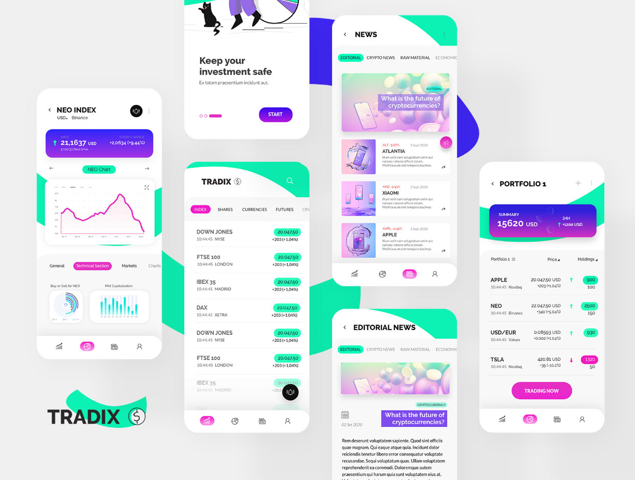 A free Figma Tradix Trading App UI Kit. Clean and modern user interface design with well organized and structured layers. Trading App UI Kit is composed of 32 screens: 16 in dark mode and 16 in light mode. A useful Figma design concept for your next project.