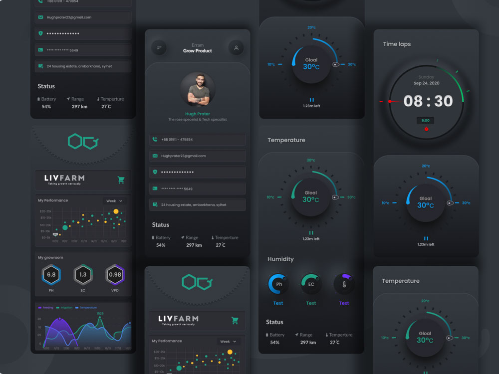 An indoor automated farming mobile template created in Figma. The app contains screens for measuring the temperature of the room, humidity. It can also keep track of the growth performance via charts. New free UI resource created by syful islam.