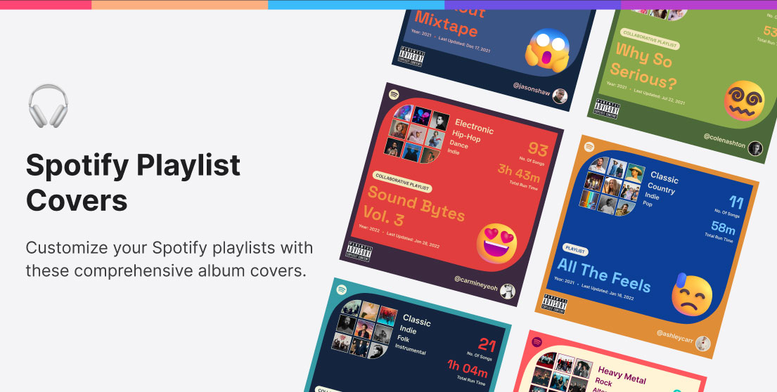 Today, we bring a very useful design template resource, Spotify Album Playlist Covers Figma Designs. Customize your Spotify playlists with these comprehensive album covers. Visually represent useful information in a single image. Includes: